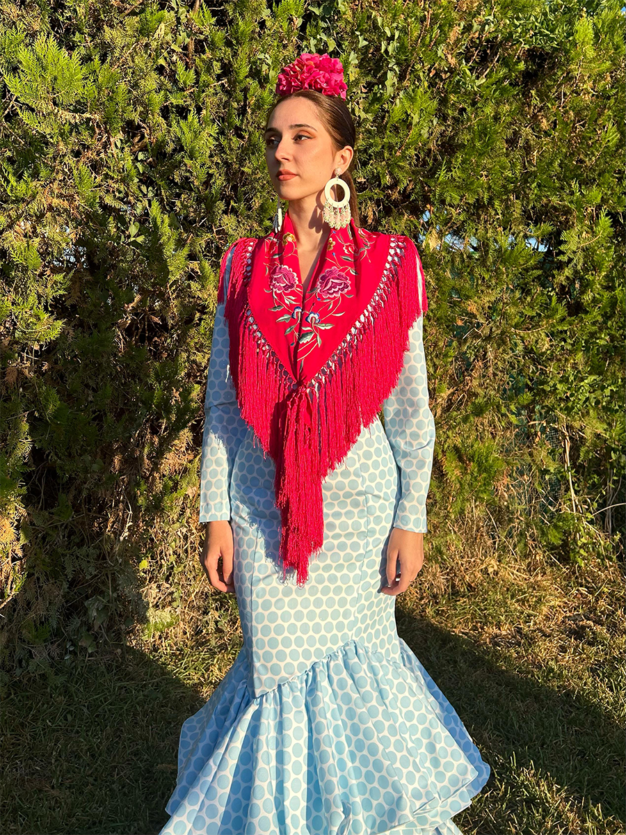 El vibrante mantón rojo que cubre el traje de flamenca añade un toque de audaz elegancia y tradición. Su intenso color contrasta a la perfección con el suave azul del vestido, mientras que el bordado floral y los flecos fluidos aportan movimiento y estilo. Más que un accesorio, es un símbolo impactante del espíritu flamenco y la fuerza femenina.