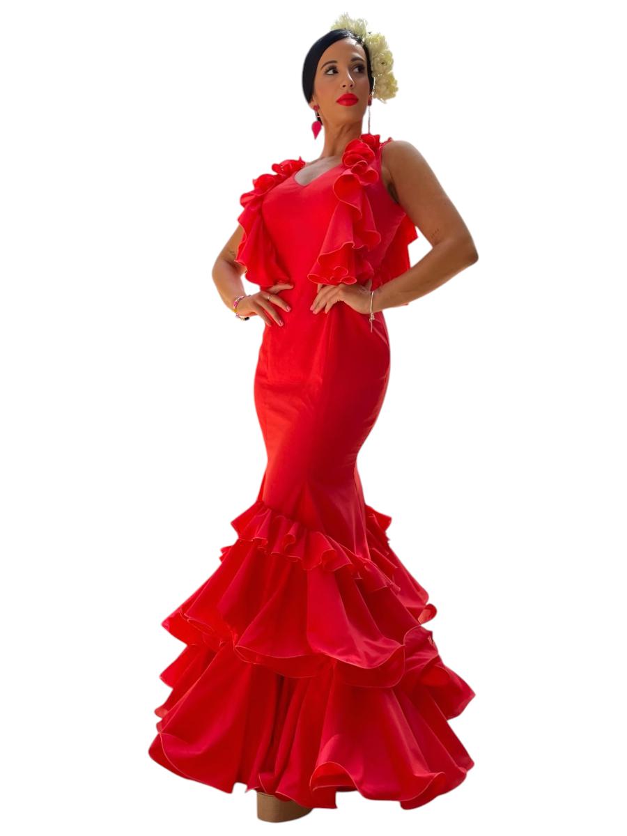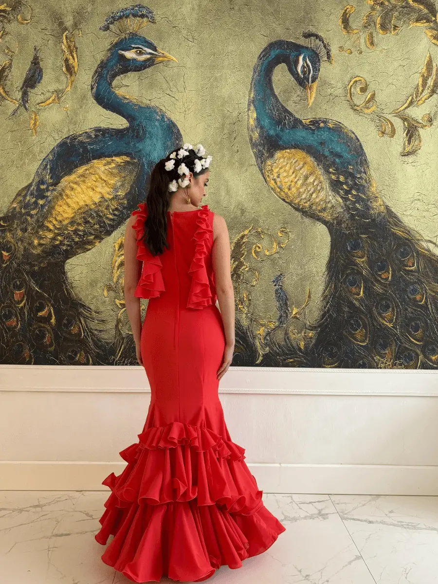Este vestido de flamenca sin mangas presenta un corte limpio en la sisa que aporta un toque moderno y minimalista a su elegancia tradicional. Aporta sofisticación y lo hace perfecto para climas cálidos o actuaciones intensas.