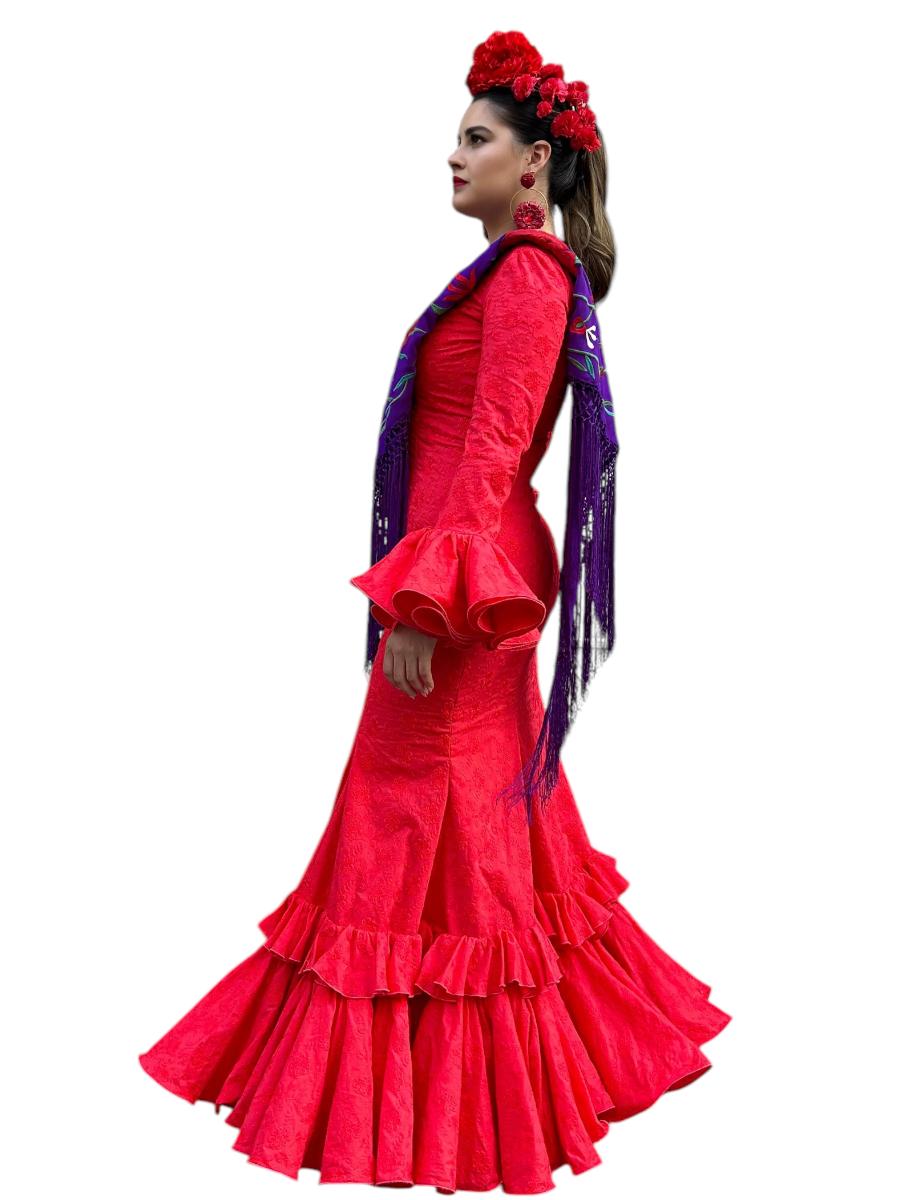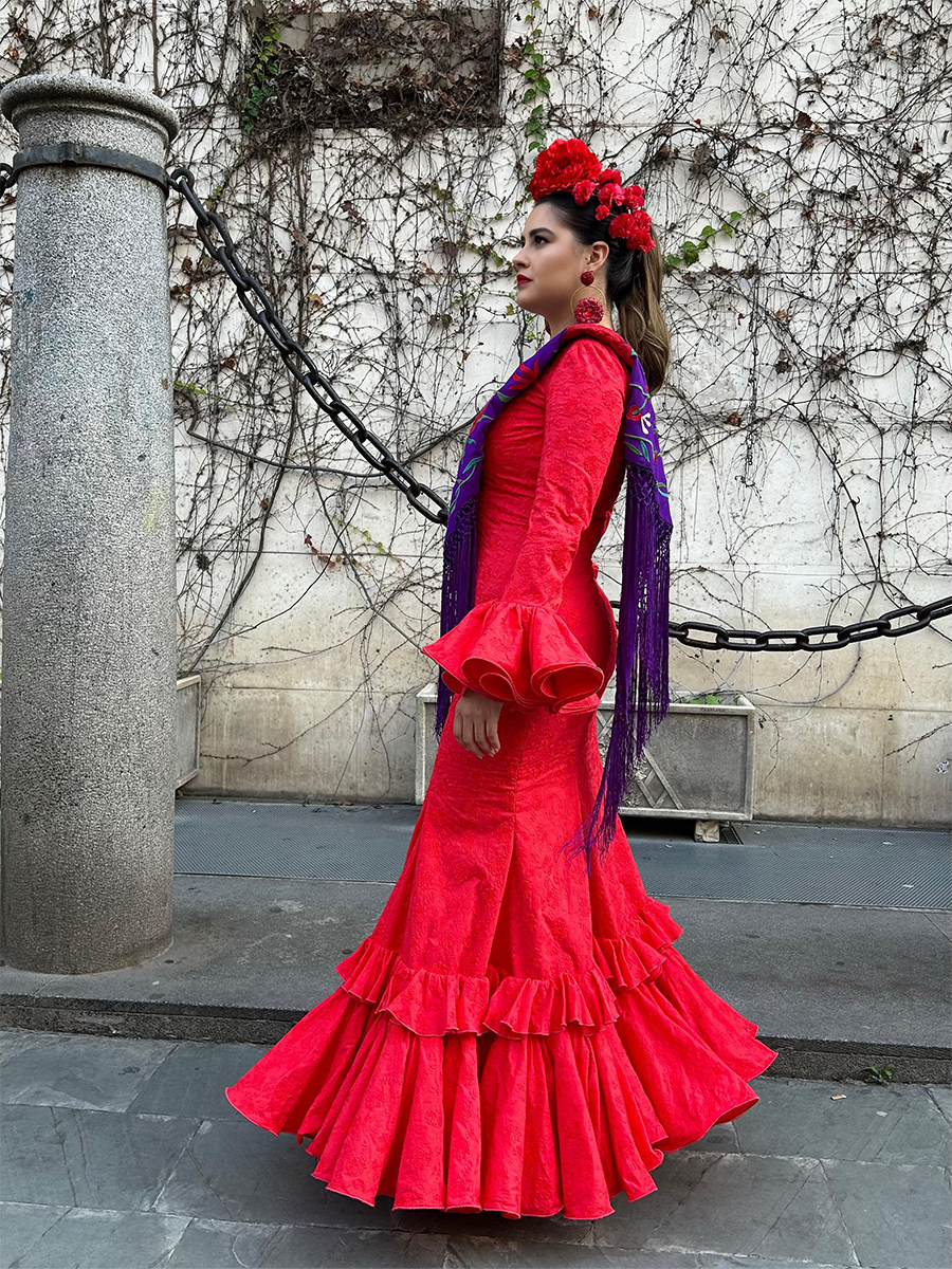 Las mangas largas lucen volantes en los bordes y tres pequeños volantes, creando fluidez y expresión en cada movimiento, manteniendo el encanto clásico del flamenco.