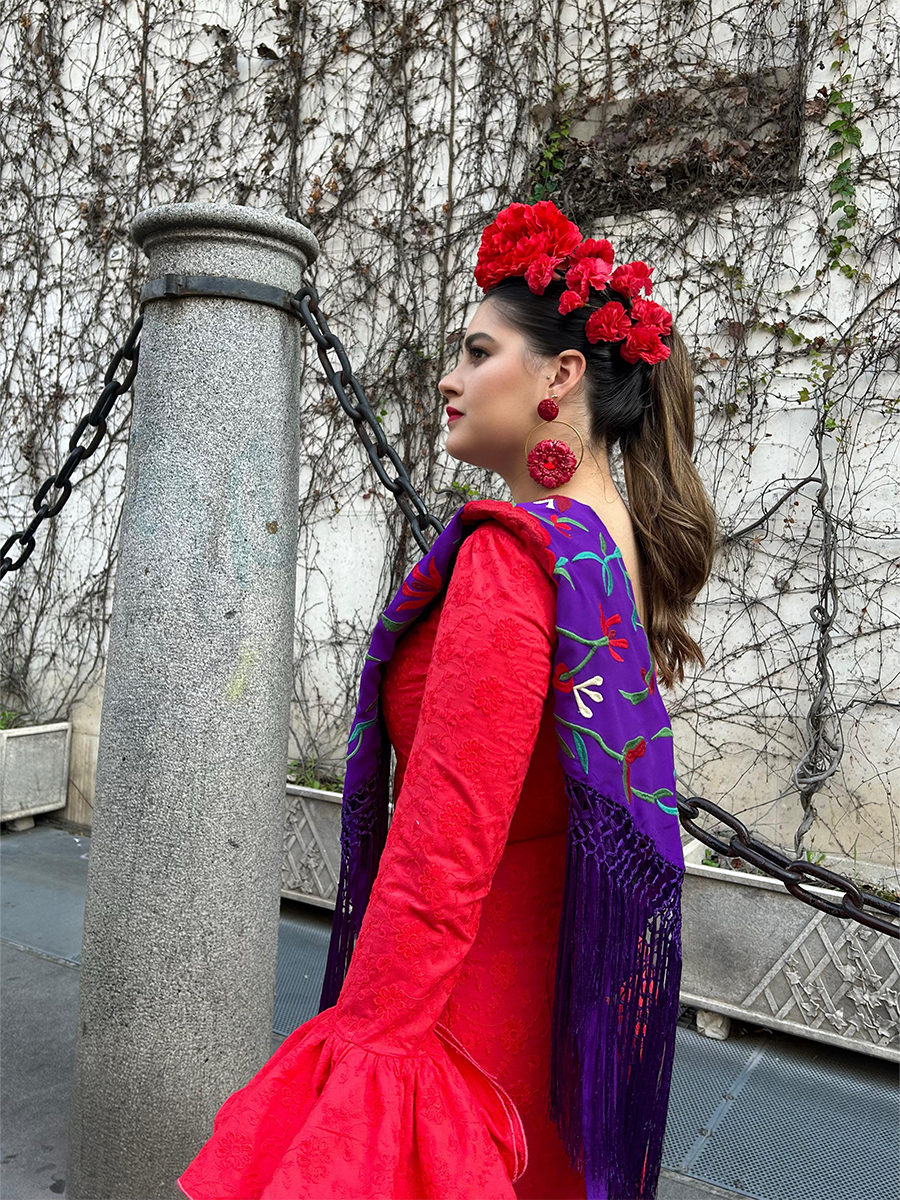 - Mantón: Morado con estampado floral y flecos largos, sobre los hombros