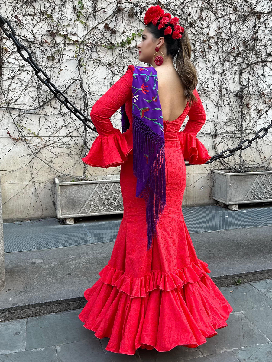 Como una flor que florece al calor del fuego, Artemisa captura la energía apasionada del flamenco español con gracia poética. De la exclusiva colección Sonibel, este vestido está confeccionado en lujoso brocado de algodón, ofreciendo una estructura y una textura suave que da vida a cada detalle. Su color rojo intenso refleja la intensidad de los atardeceres andaluces y la pasión del baile. El escote en V delantero y trasero estiliza la parte superior del cuerpo con elegancia, mientras que las mangas largas presentan tres delicados volantes y suaves bordes que ondulan con cada gesto. La falda fluye hasta un impactante corte sirena, realzado por un volante grande y uno pequeño, que añade dramatismo, dimensión y movimiento a tu look.