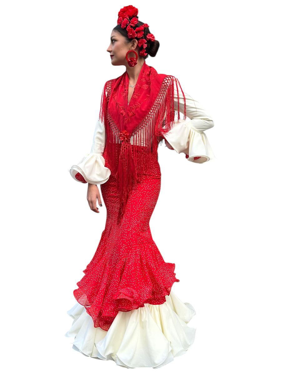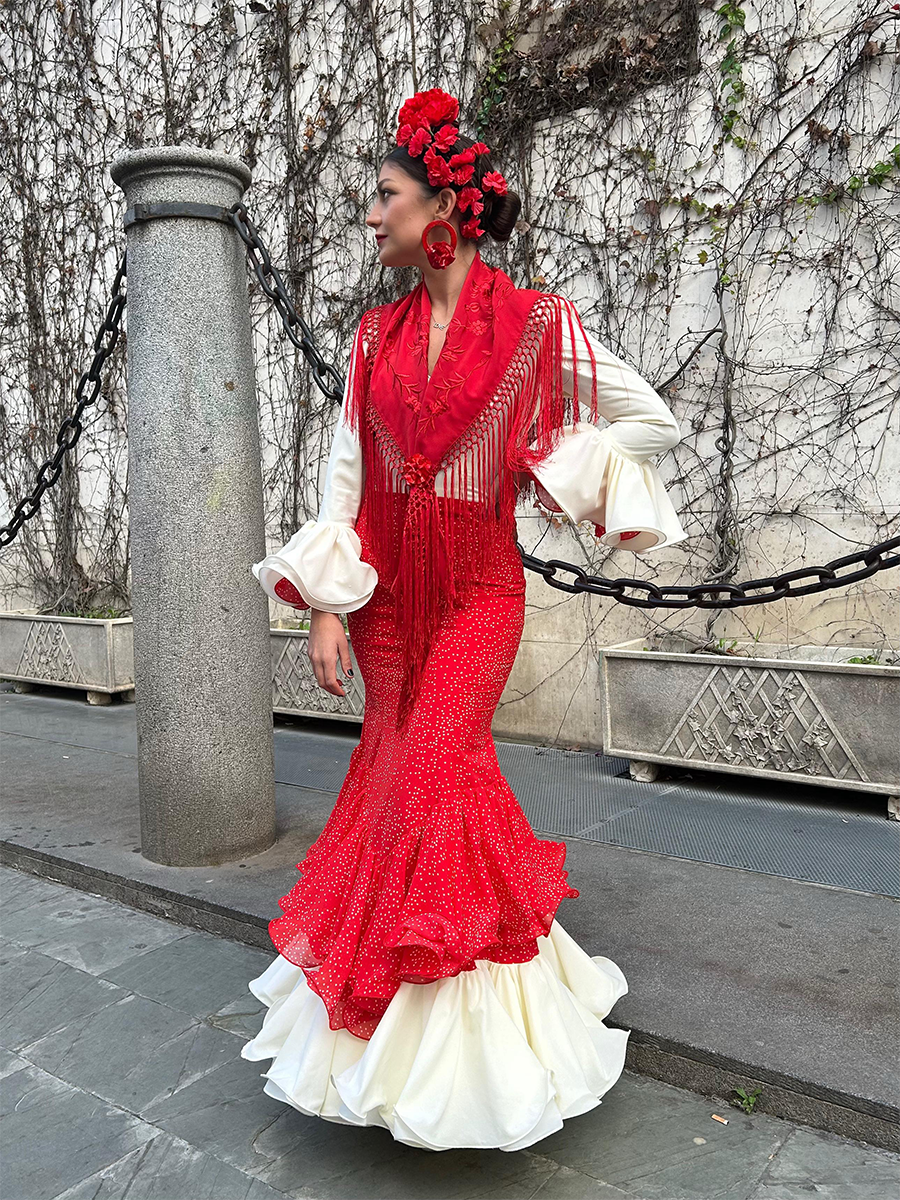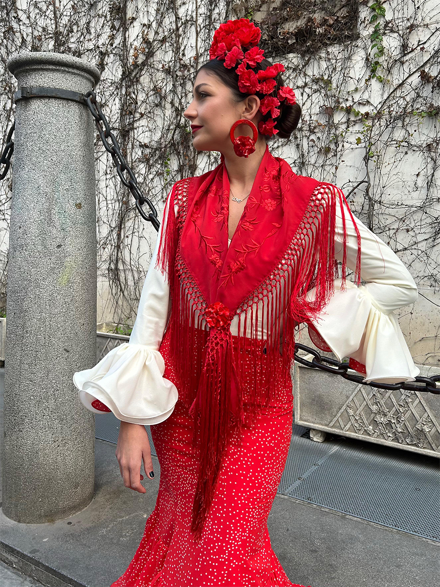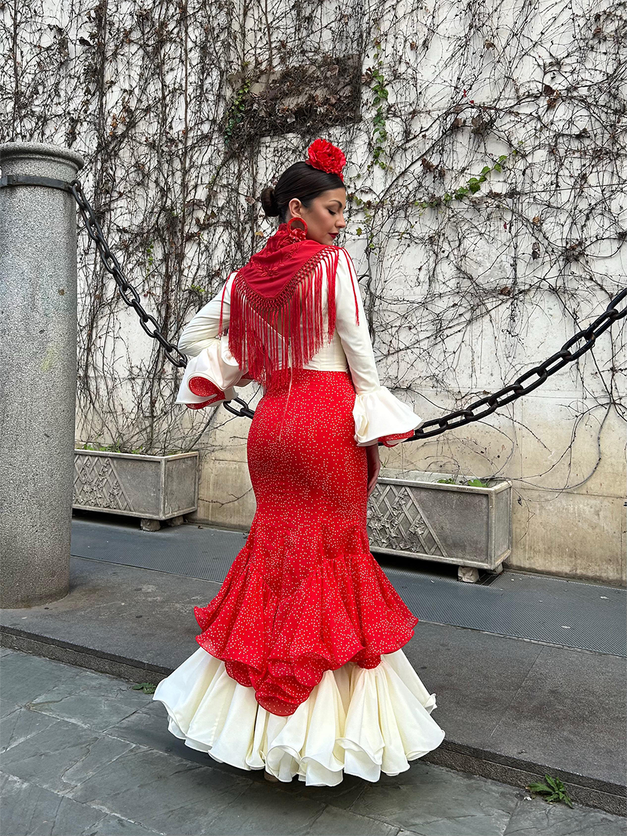 Combinado con un mantoncillo rojo intenso bordado, ligero y con flecos, el conjunto se completa con un estilo atemporal. Cubierto sobre los hombros y anudado suavemente en la parte delantera, el chal añade dimensión y tradición, evocando el ritmo del flamenco con cada balanceo.