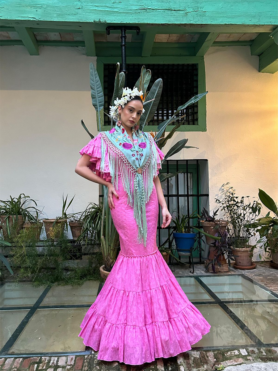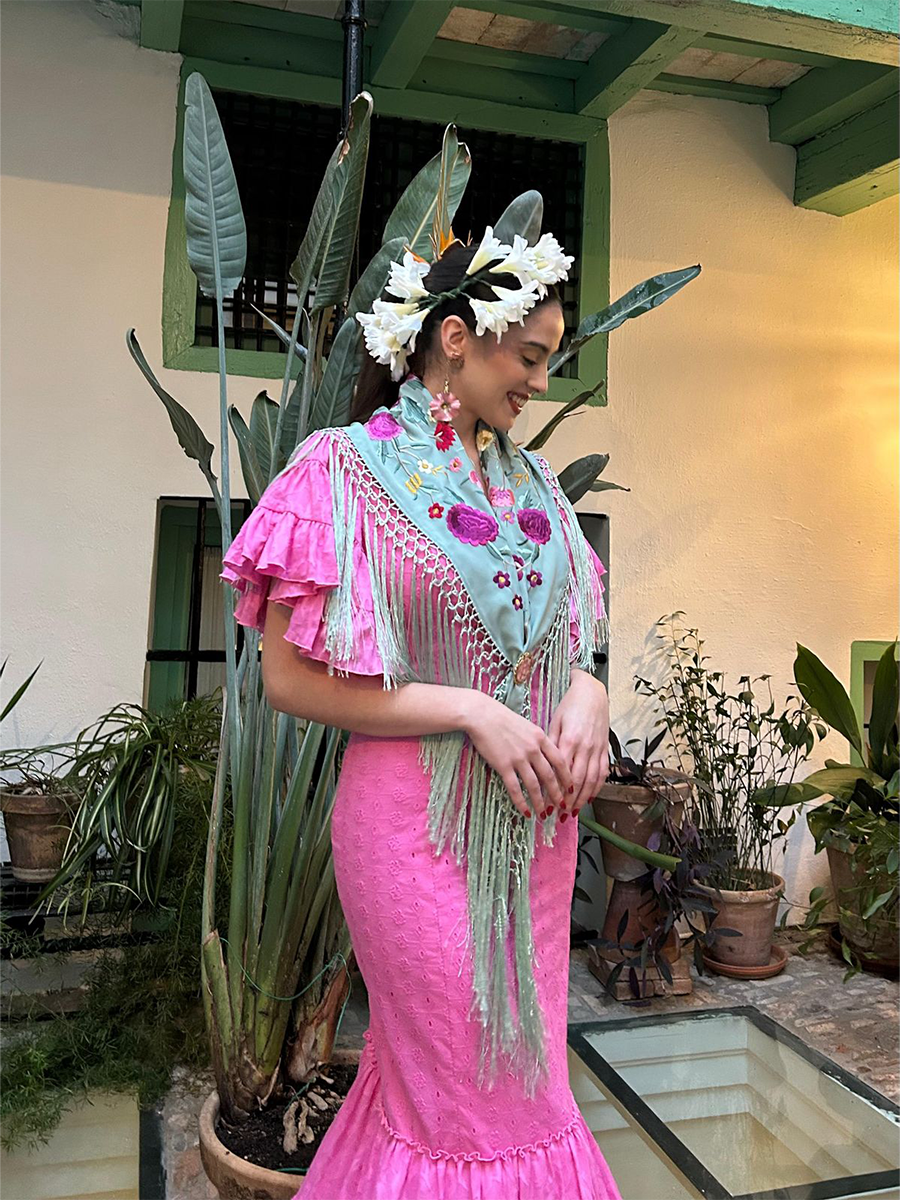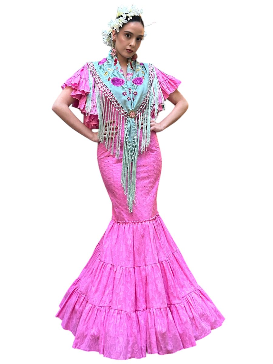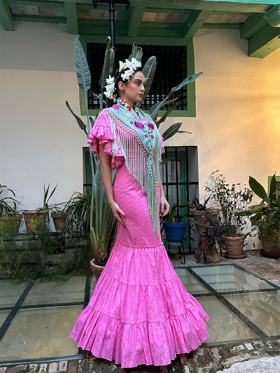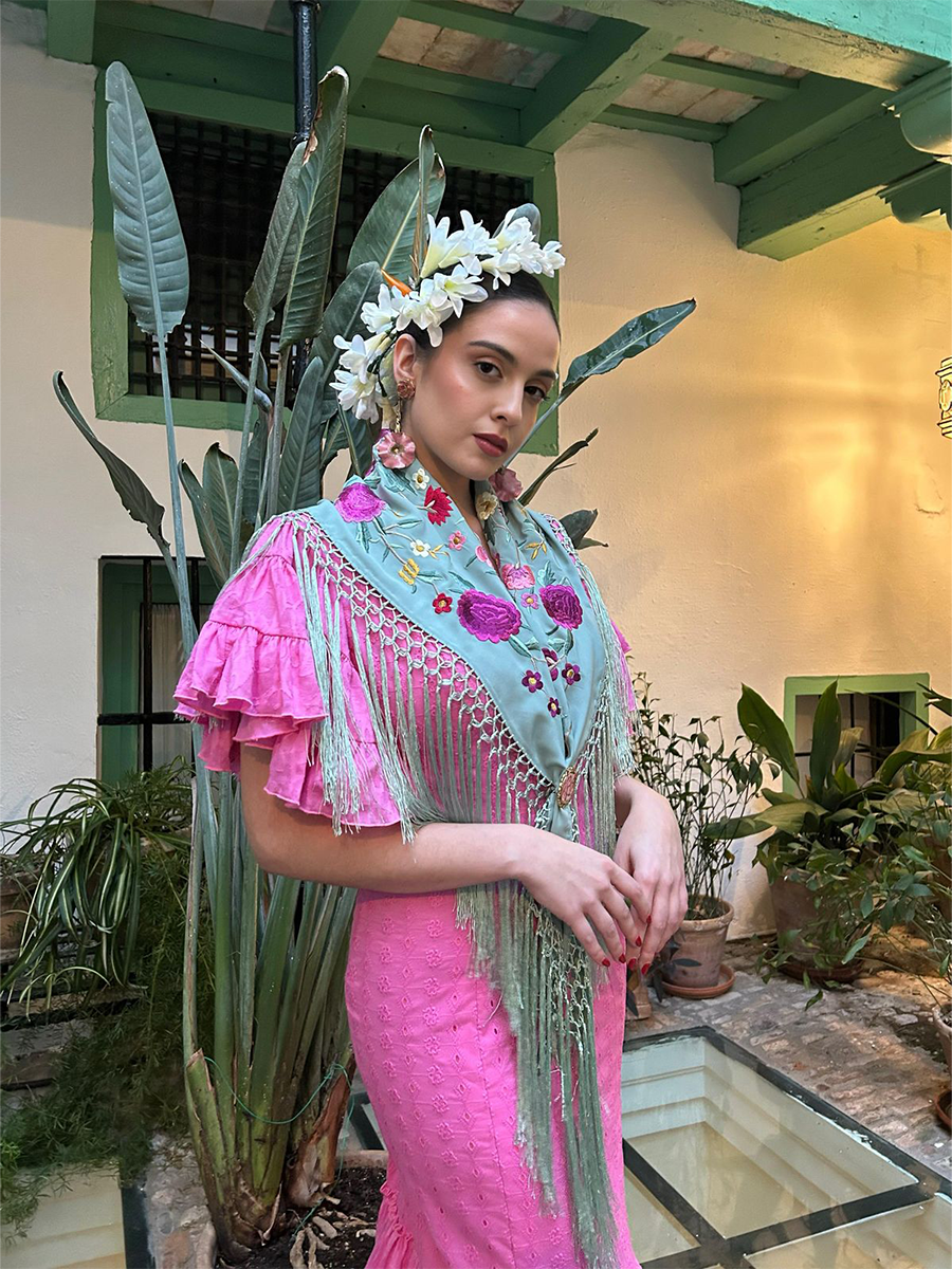 Lo que realmente realza este look es la incorporación de un mantoncillo delicadamente bordado en azul agua, adornado con bordados florales multicolores y largos flecos en cascada. Cubierto sobre los hombros y anudado en la parte delantera, como en el look mostrado, crea un acabado romántico y tradicional, un guiño a los trajes sevillanos y a la elegancia festiva. Perfecto para trajes de feria, trajes de peregrinación o apariciones elegantes en reuniones de flamenco, Crocus es una declaración del arte andaluz y la feminidad moderna, ideal para quienes buscan una belleza arraigada en la cultura y diseñada para el movimiento.
