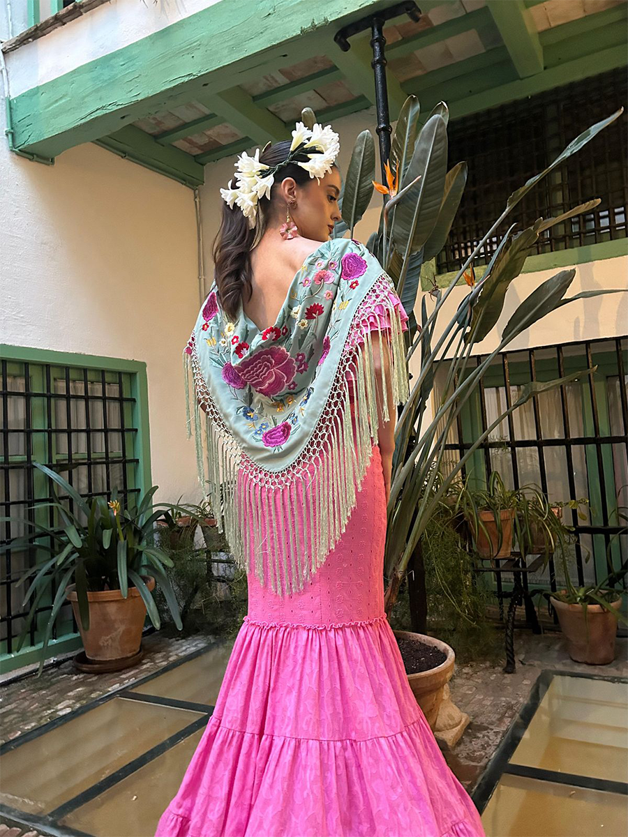 El mantoncillo azul agua, con un rico bordado floral multicolor y flecos, añade contraste de color y completa el look flamenco con un toque festivo. El diseño, con caída sobre los hombros y anudado en la parte delantera, le aporta personalidad y elegancia.