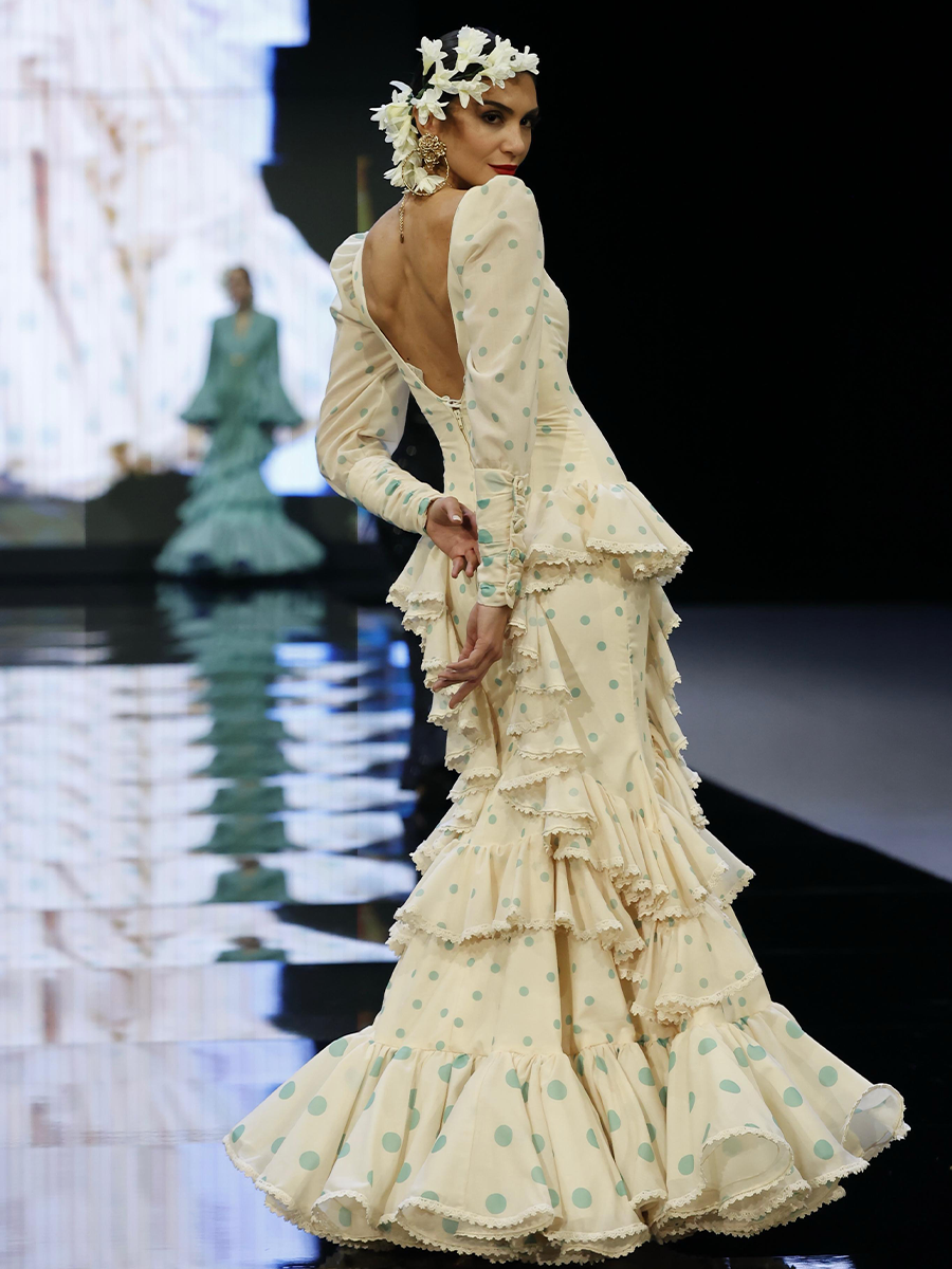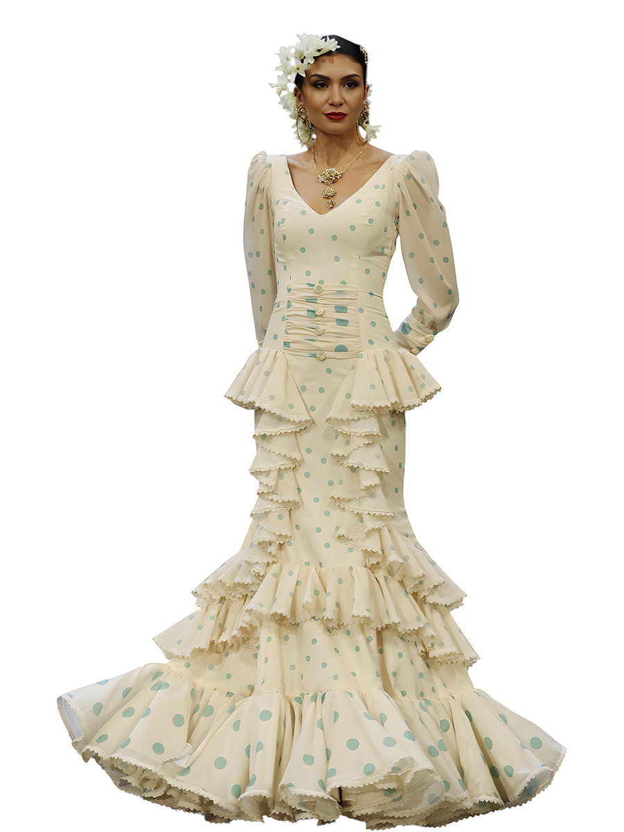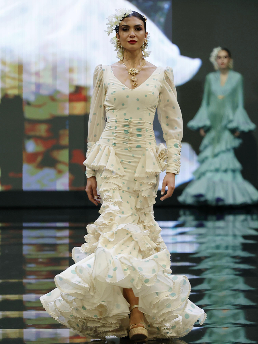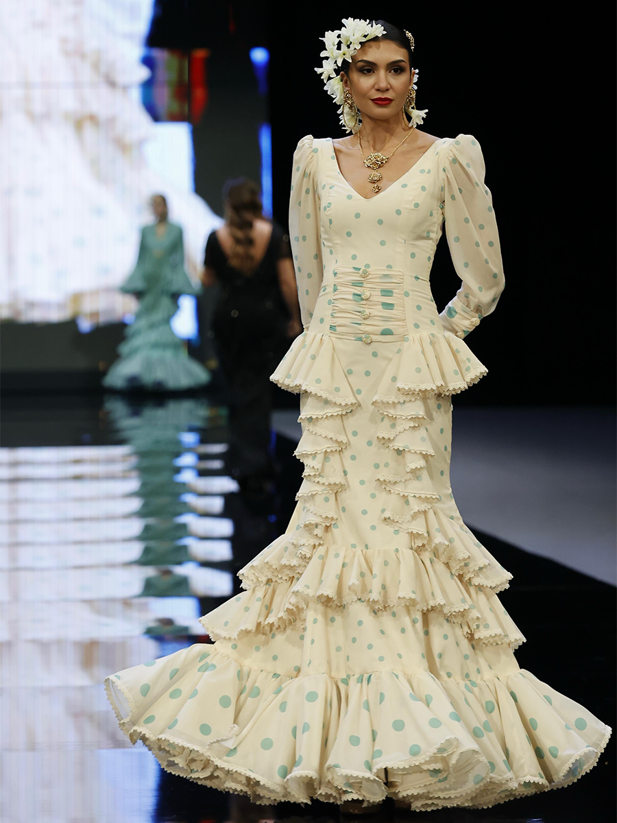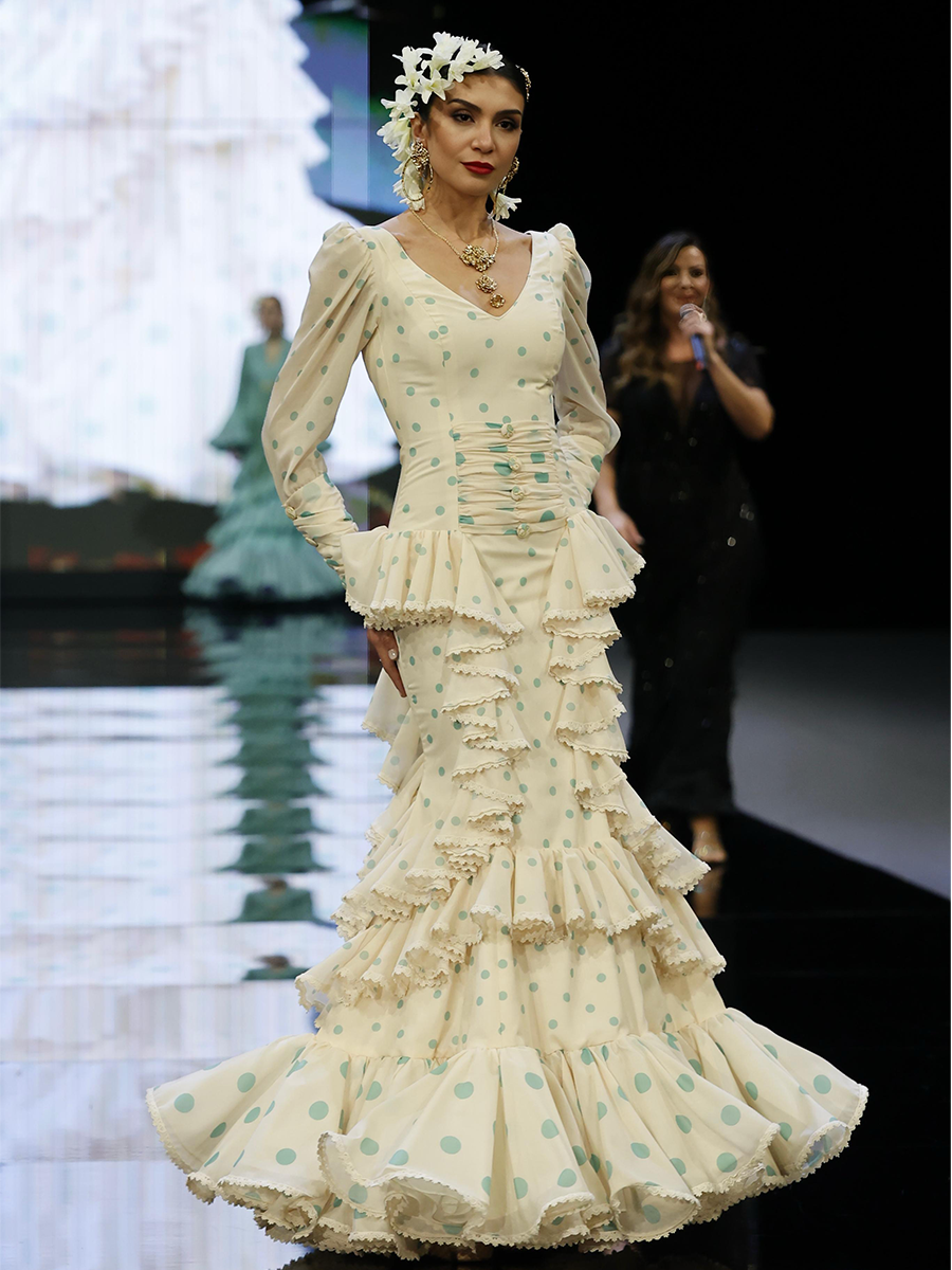 Aljarafe es una prenda destacada de SIMOF 2025 que combina un diseño moderno con la atemporalidad del arte español. Desde su elegante paleta de lunares hasta sus detalles de alta costura, cada elemento está diseñado para llamar la atención. Es la elección perfecta para quienes aprecian la moda de pasarela con raíces en la tradición.