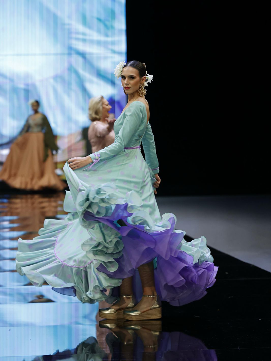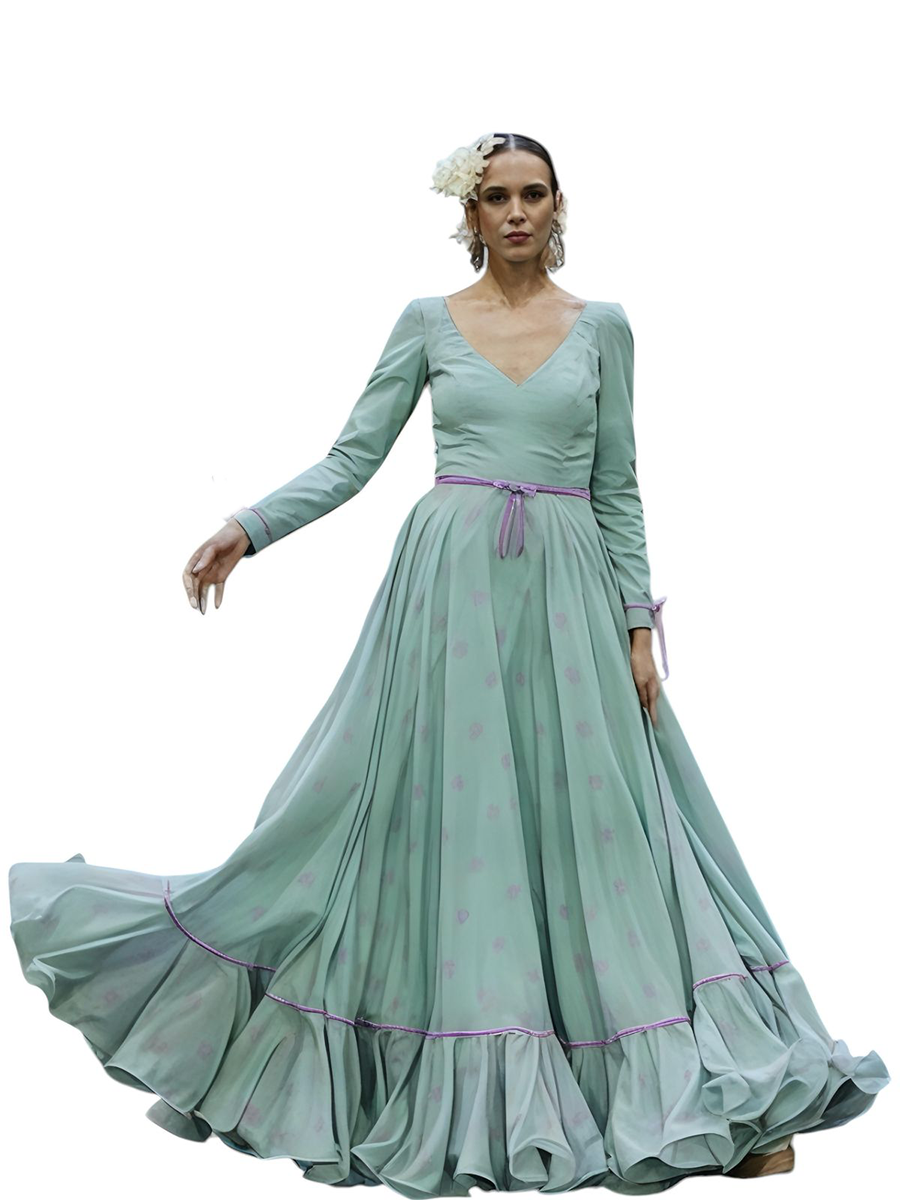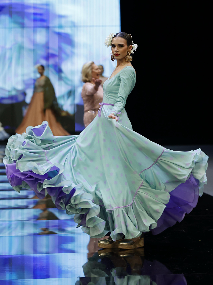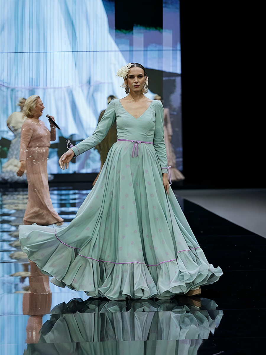 Como la niebla matutina sobre las colinas andaluzas, el vestido Barquera de Sonibel es suave, elegante y lleno de movimiento. Destacado en SIMOF 2025, este look actualiza el vestuario con elegante fluidez y encanto moderno. Confeccionado en batista de algodón de primera calidad, ofrece un tacto suave y una hermosa forma que se desliza con naturalidad en cada movimiento. Su base verde agua pastel, salpicada de lunares lilas, evoca una brisa fresca en los huertos primaverales. La dramática falda estilo capa fluye con ligereza, mientras que los ribetes de cinta de terciopelo y los delicados lazos añaden el toque perfecto de detalle, femenino, refinado y característico de Sonibel.
