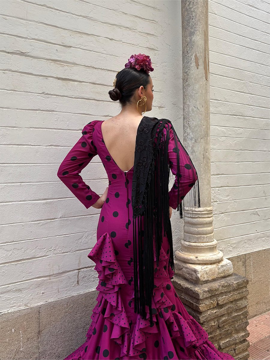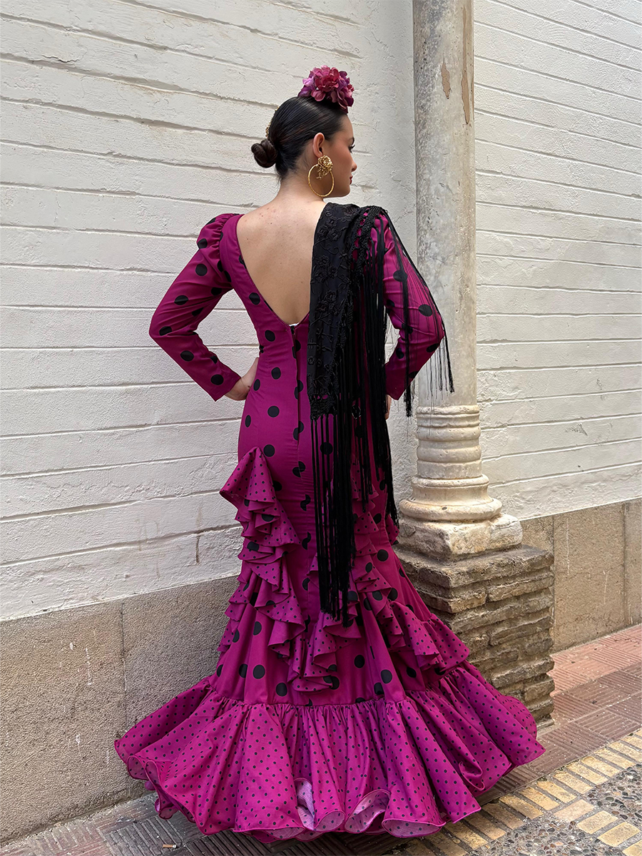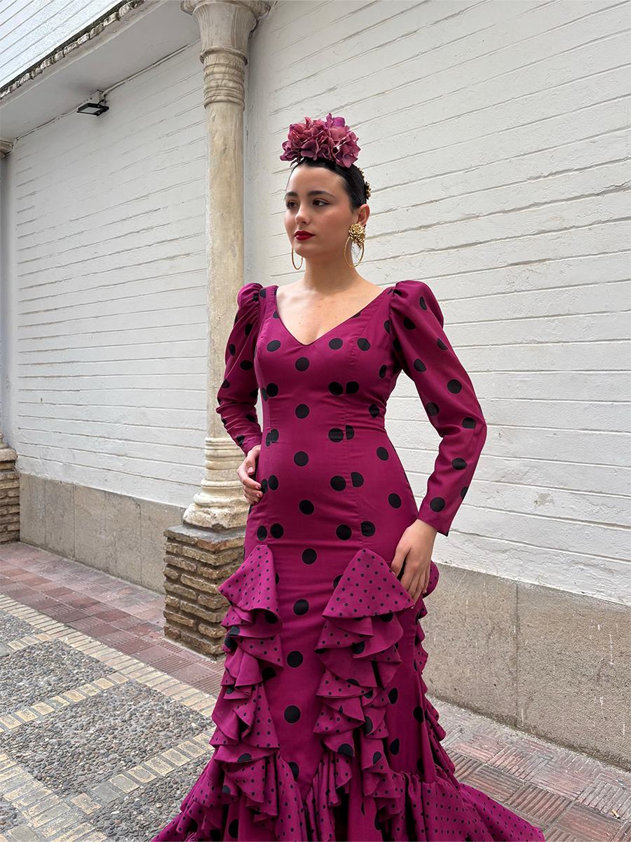 Con un profundo escote en V tanto en la parte delantera como en la trasera, el vestido añade sofisticación a tu look flamenco. Las mangas largas abullonadas aportan volumen y romanticismo, rematadas con delicados volantes que evocan el encanto tradicional sevillano.