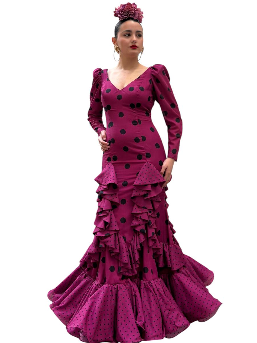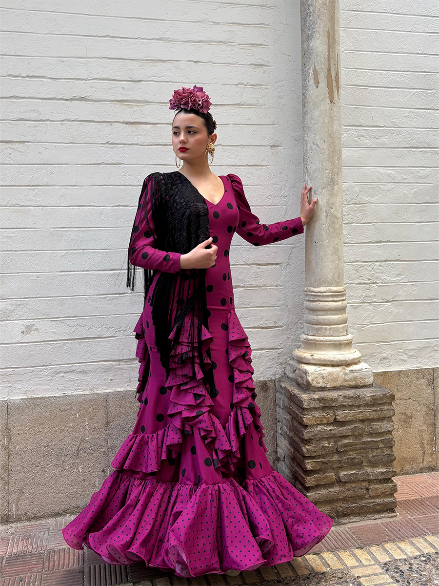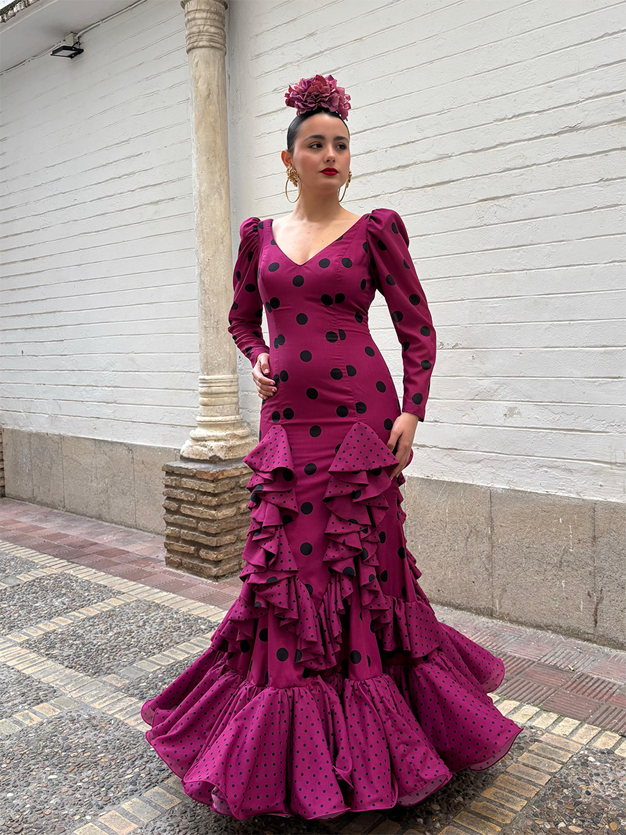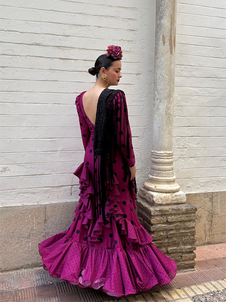 Con un profundo escote en V tanto en la parte delantera como en la trasera, el vestido añade sofisticación a tu look flamenco. Las mangas largas abullonadas aportan volumen y romanticismo, rematadas con delicados volantes que evocan el encanto tradicional sevillano.