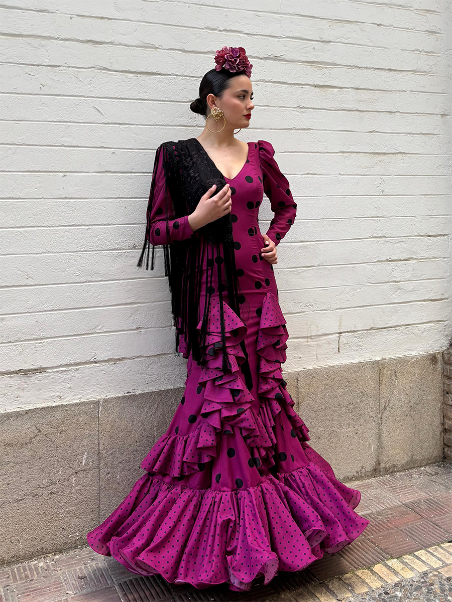 El vestido de flamenca Edelweiss de Sonibel es una audaz celebración de la elegancia andaluza. Está confeccionado en batista de algodón transpirable en un vibrante tono buganvilla con alegres lunares negros en dos tallas, evocando la alegría de la primavera. Con un favorecedor escote en V delante y detrás, mangas largas abullonadas adornadas con delicados volantes y una silueta sirena que realza la figura, este vestido se mueve al ritmo de cada paso. Su falda presenta un volante grande, uno pequeño y cuatro dinámicos volantes diagonales que aportan dramatismo y estilo a cualquier celebración flamenca. El mantón negro con largos flecos, que se extiende con naturalidad sobre un hombro, añade un contraste impactante, abrazando la esencia tradicional de la moda sevillana. Disponible en las tallas 34 a 44 y totalmente personalizable, Edelweiss es la opción perfecta para ferias, romerías y para quienes buscan brillar con el auténtico estilo flamenco.