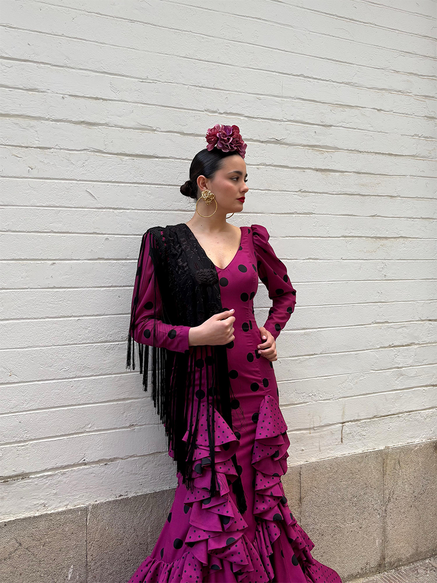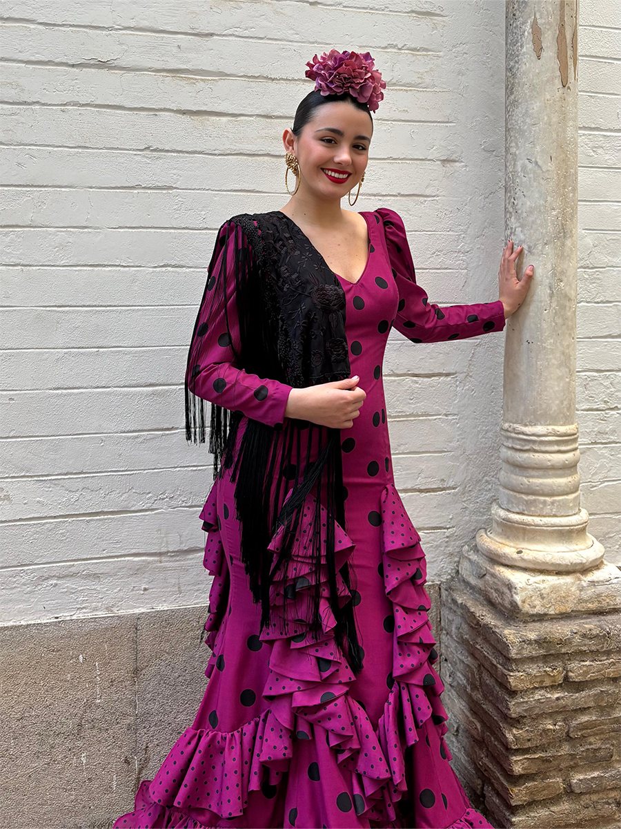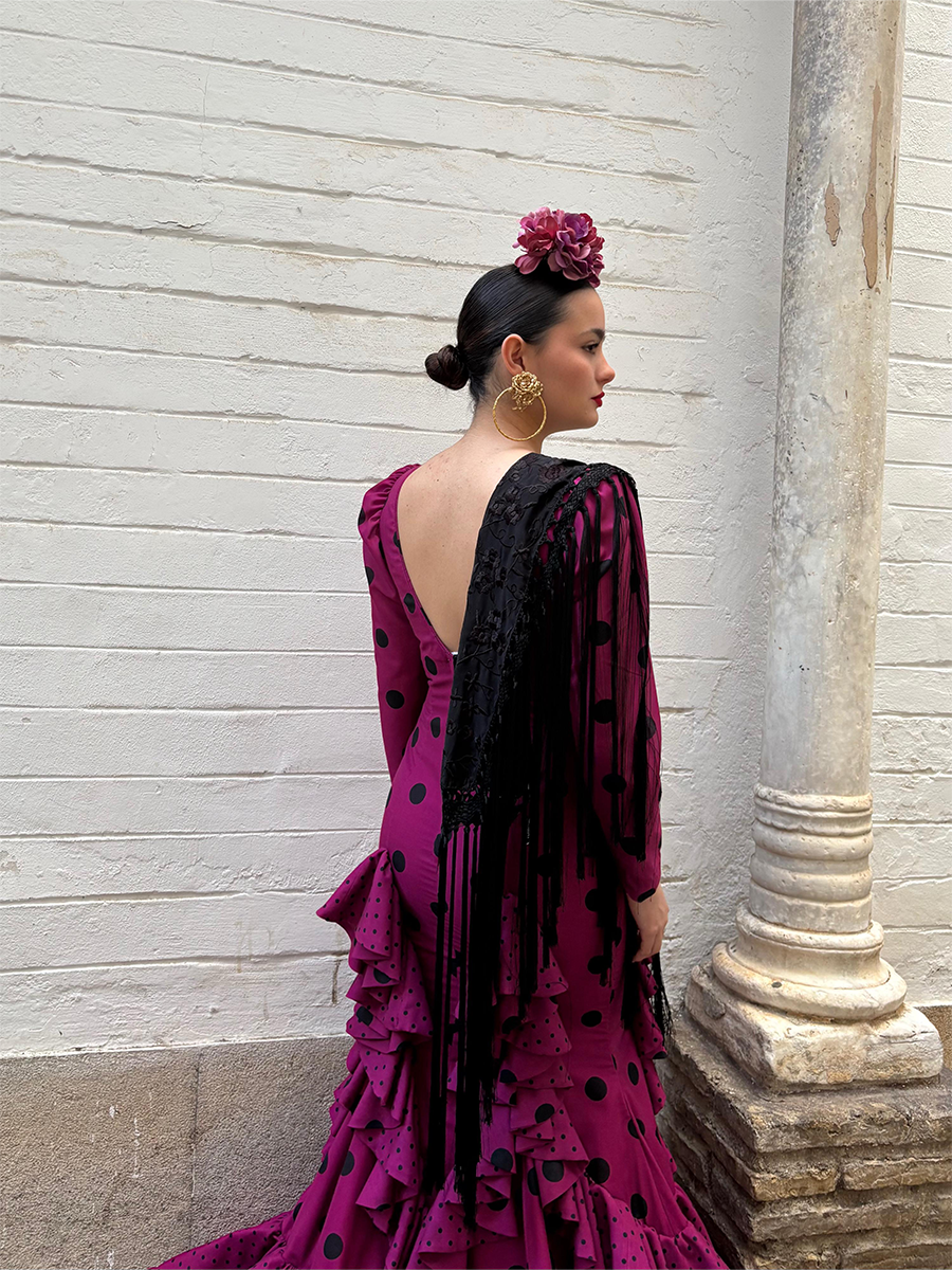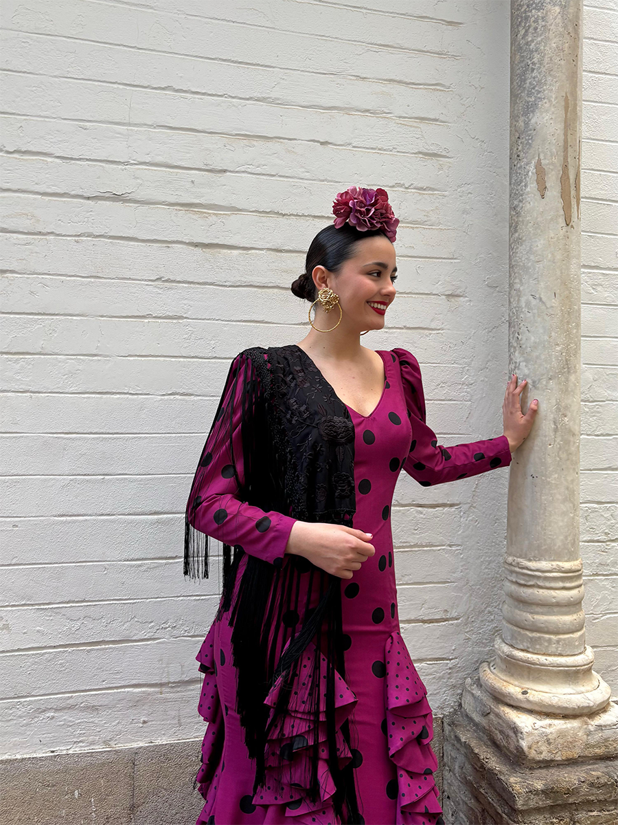 El look se completa con un clásico mantoncillo negro adornado con largos flecos, que cae de forma informal sobre un hombro. El intenso contraste aporta dramatismo y tradición, equilibrando a la perfección la vitalidad del vestido.